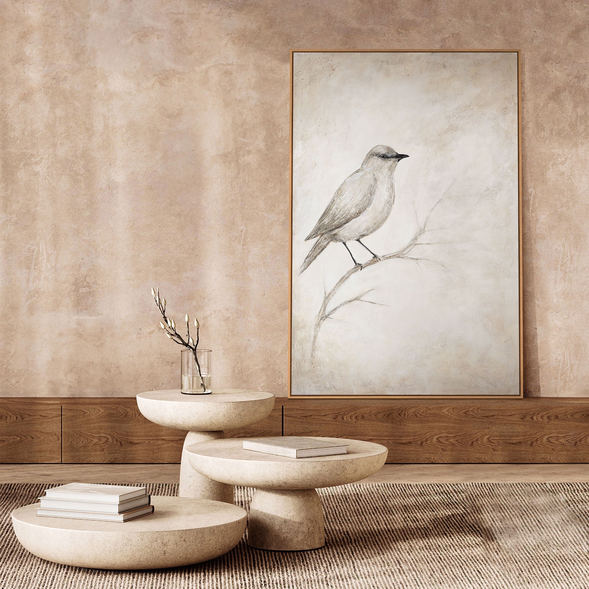 This bird wall art captures a moment of quiet stillness through a minimal natural composition. Still Perch features a softly rendered bird resting on a delicate branch, set against a calm neutral background that emphasises lightness and simplicity. The vertical format enhances elegance and focus, making this botanical wall art especially suitable as wall art for bedroom interiors or serene living spaces.