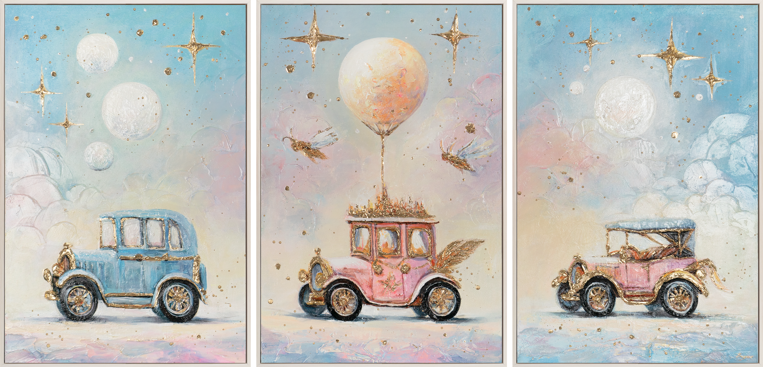 The triptych "Fairy Tale Street" transports children into a magical world with lovingly painted nostalgic cars and a dreamy sky, highlighted by soft pastel tones and golden accents. Each of the three canvas panels comes together to form a harmonious composition that tells stories and turns any kids’ room into a whimsical, enchanting space. The textured surface and warm color accents create a cozy and imaginative atmosphere.