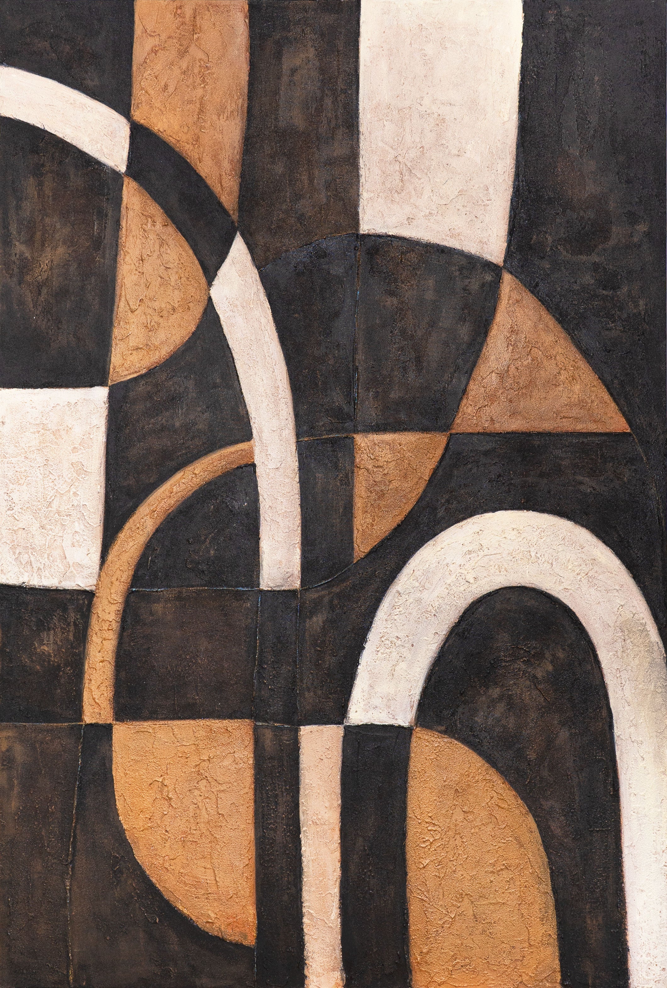 This hand-painted artwork fascinates with a play of flowing lines and geometric shapes. The combination of warm Brown, noble Beige, and deep Black creates a harmonious interplay of contrasts. The textured surface adds depth and character, making it a true focal point.