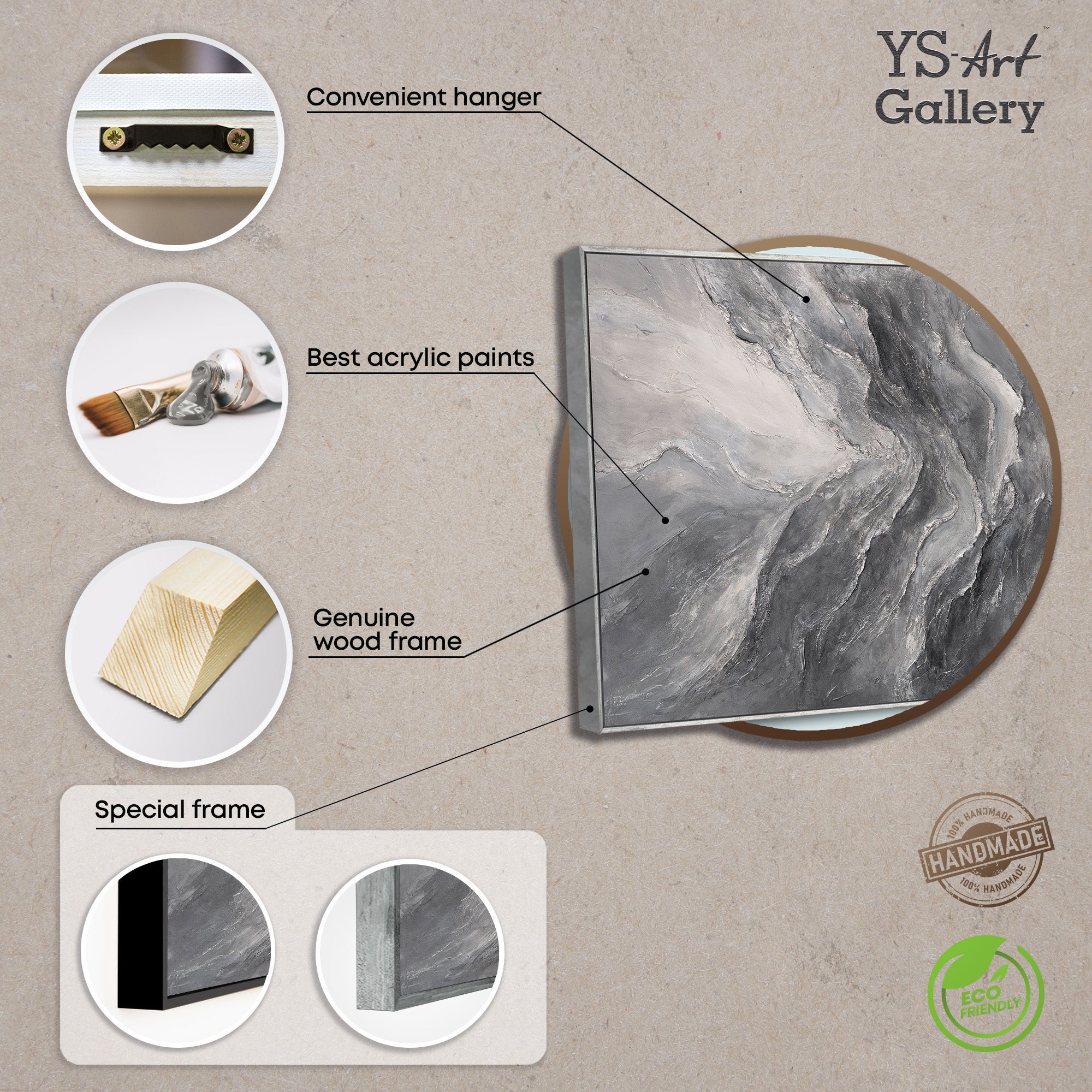 This abstract painting is created using water-based acrylic paints, layered in flowing movements that form a mineral, stone-like surface. Shades of soft grey, graphite and muted silver move across the canvas, creating large wall art designed for restful interiors. The composition brings depth without heaviness, making it ideal wall art for bedroom spaces and modern living environments. Each piece is created entirely in-house — no prints, no reproductions, no imports.