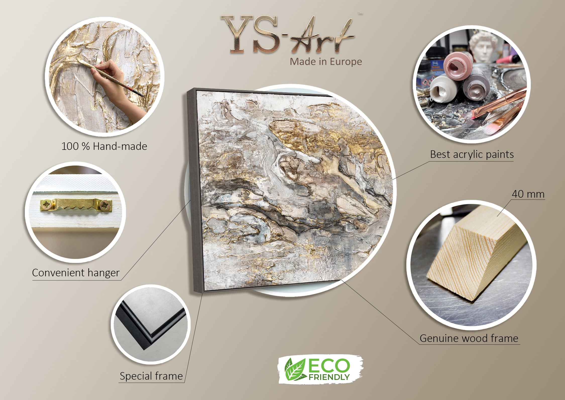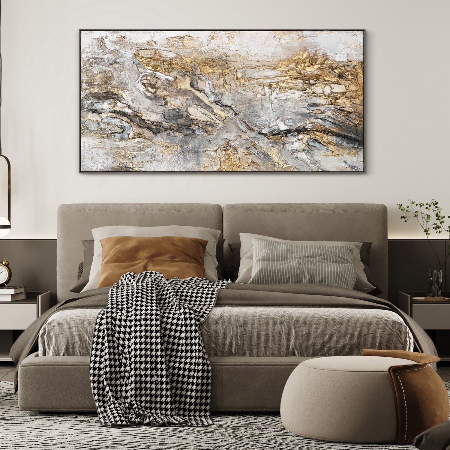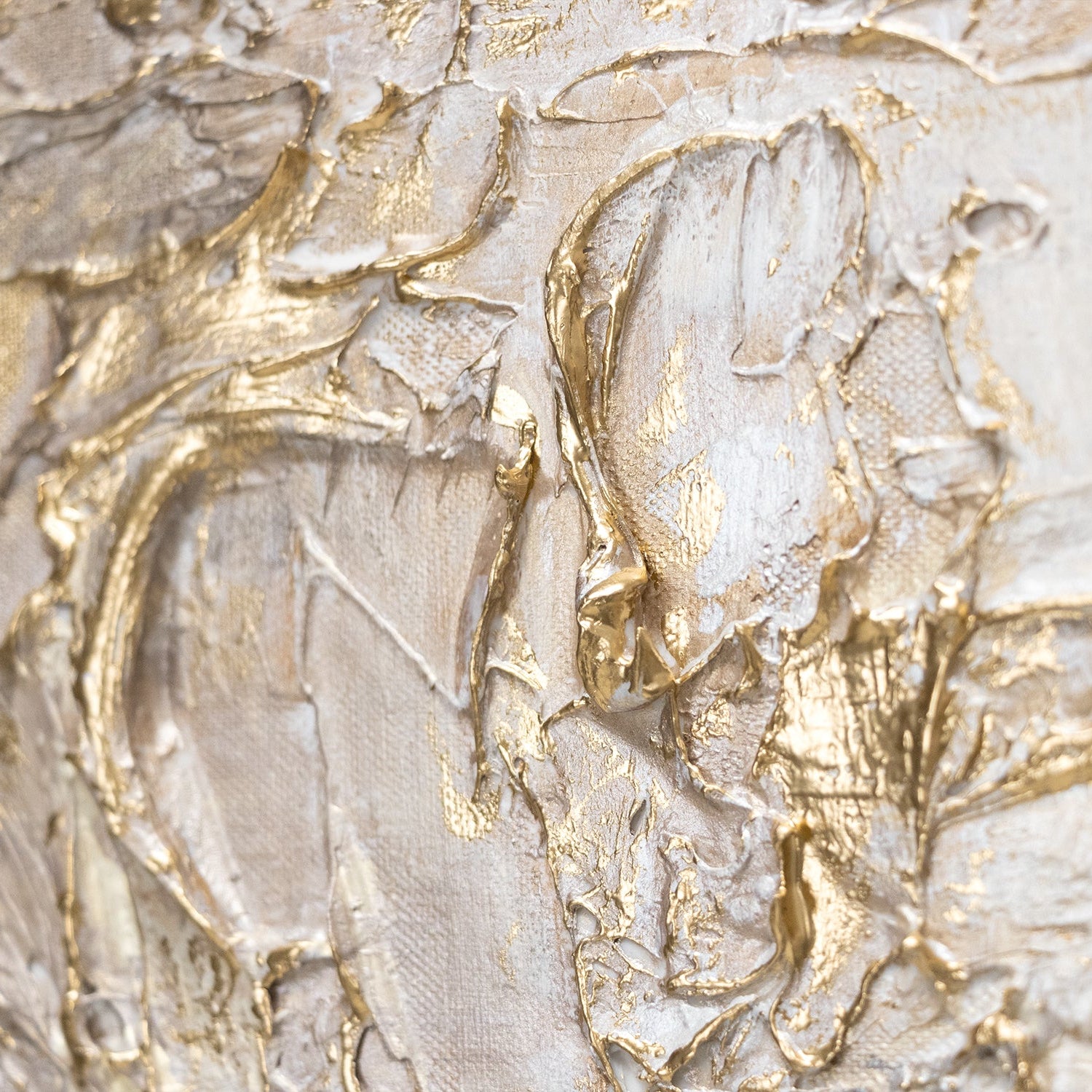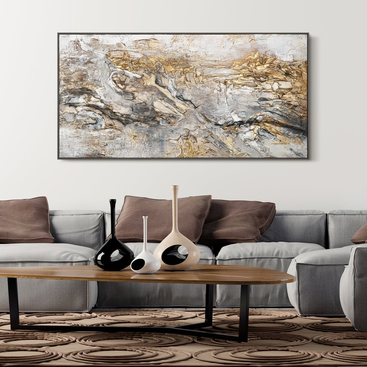 The hand-painted acrylic painting "Glow" combines powerful textures with elegant gold accents, creating a unique visual depth. The blend of grey, white, and black with shimmering gold details makes this artwork a sophisticated highlight in any modern interior. The high-quality frame accentuates the luxurious aura of the piece and seamlessly integrates into stylish living and workspaces.