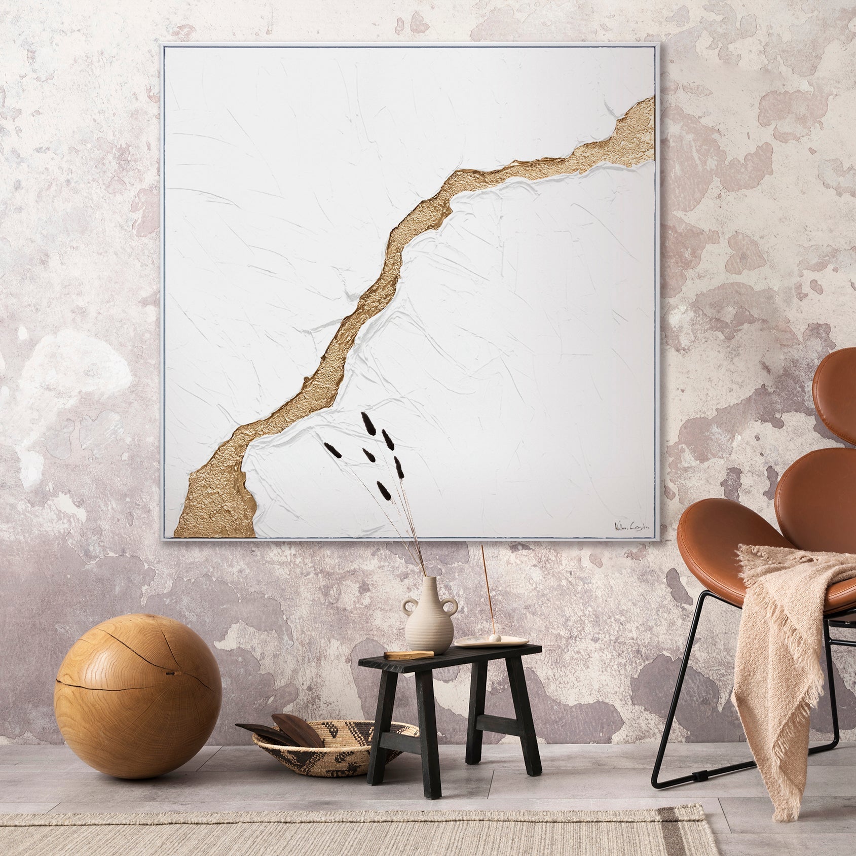 Experience the elegance of abstract art with "The Flood" – a hand-painted acrylic artwork adorned with fine gold leaf accents. The refined texture and stylish design make this painting a perfect focal point for modern living spaces. The high-quality white frame adds timeless elegance to the piece.