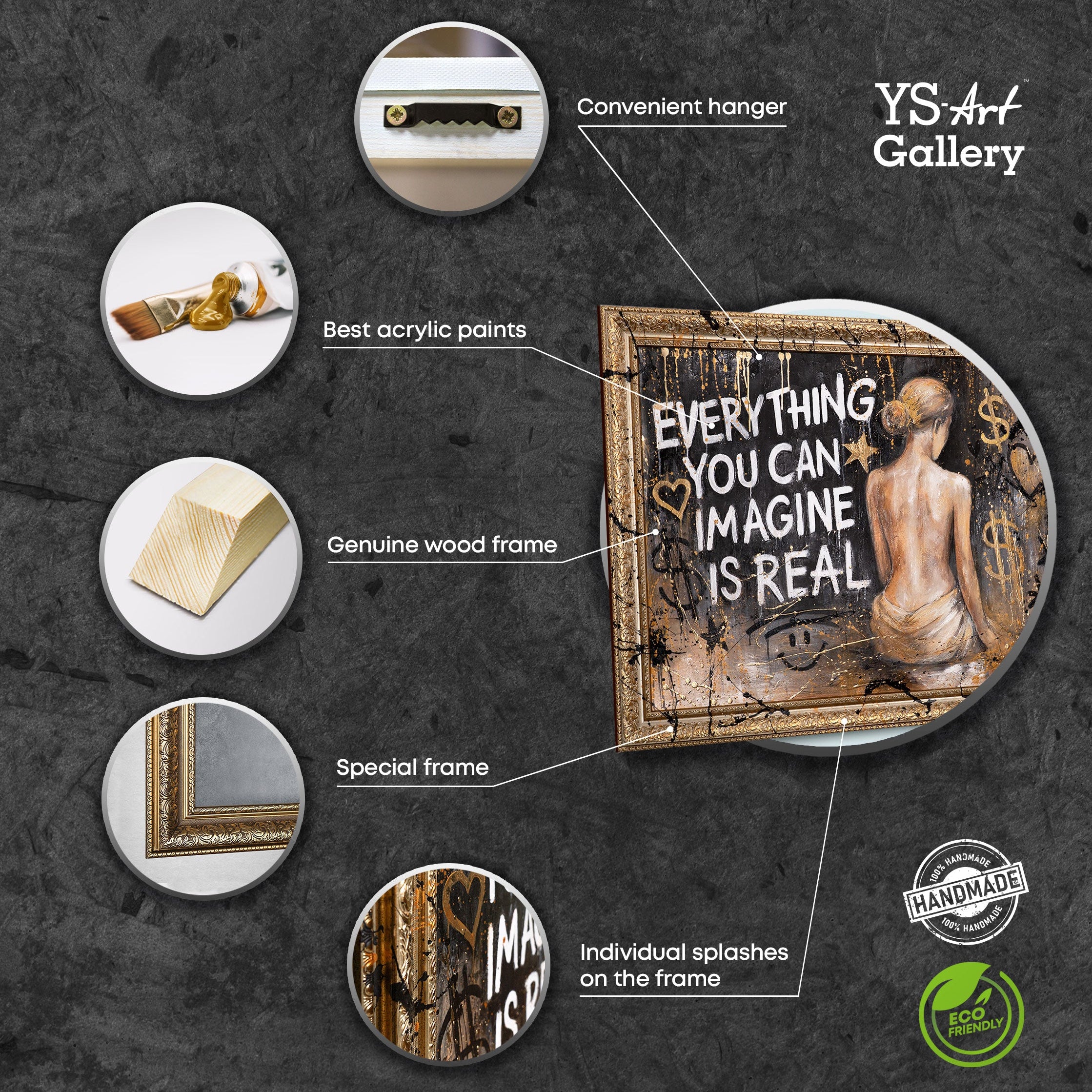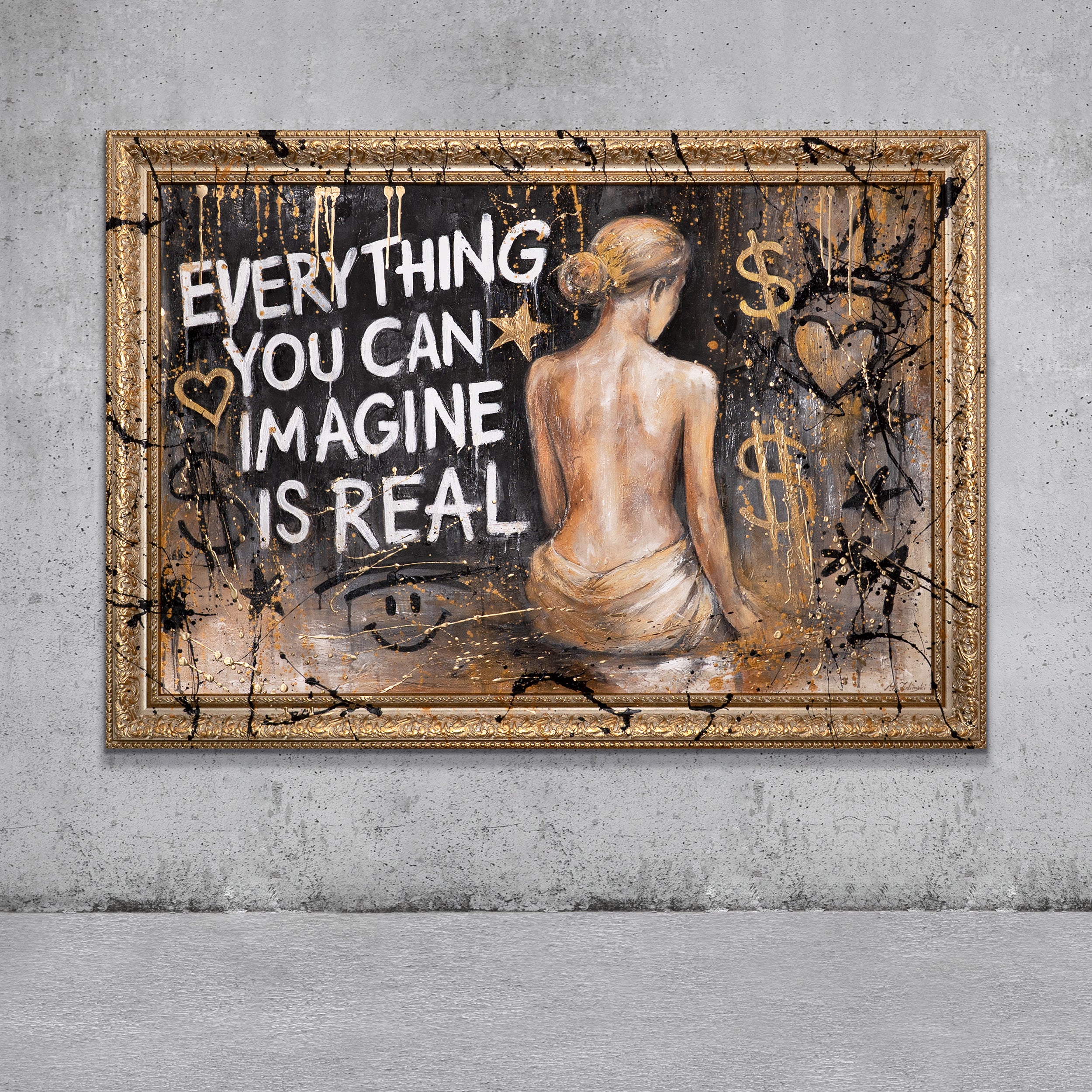 The hand-painted canvas „Everything is Possible“ is more than decoration – it’s a statement. Inspired by modern street art and classical painting, it combines lettering with figurative elements. Warm gold tones and contrasting black-and-white accents make it a true highlight for any home.