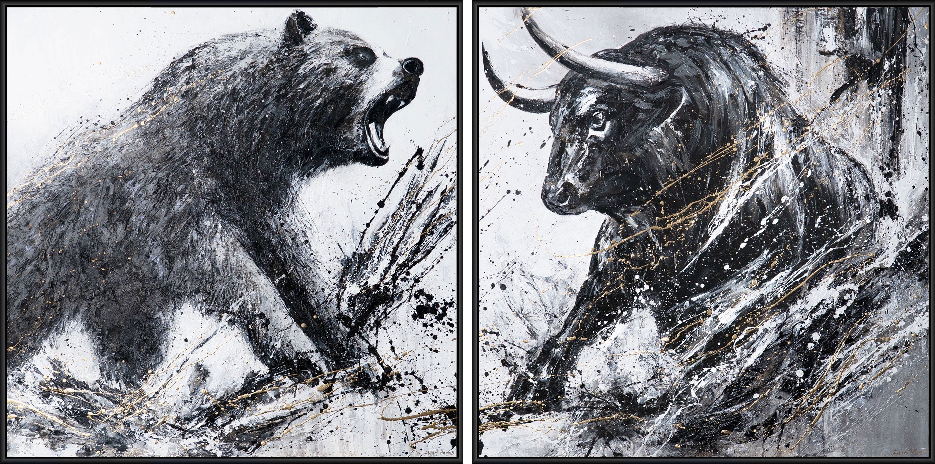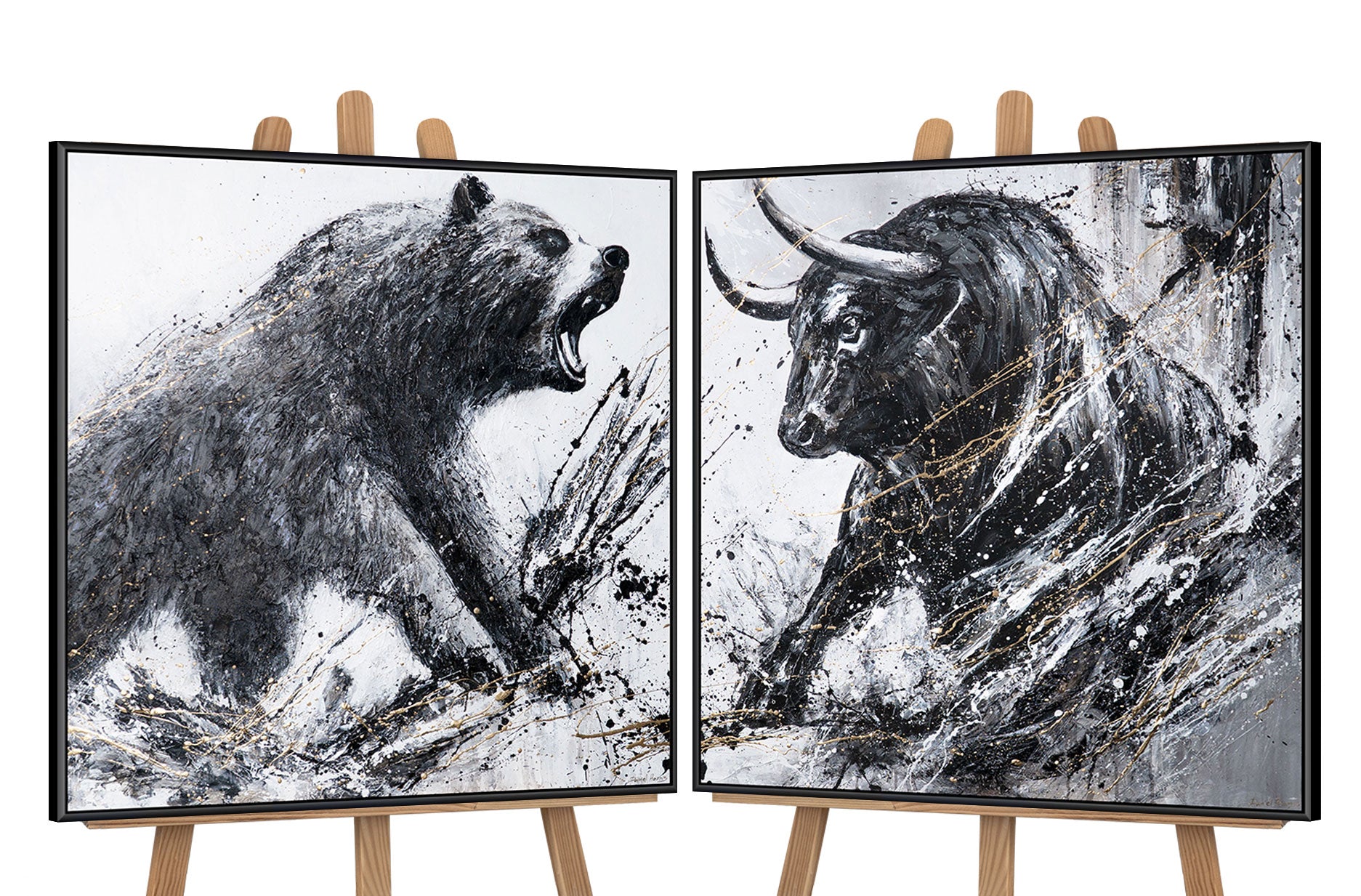 This impressive diptych features two powerful symbols from the world of markets: the roaring bear and the aggressive bull. Rendered in contrasting black and white with golden accents, the two canvases reflect not only animal energy but also emotional opposites such as attack and defense, control and impulse. The textured brushstrokes and dynamic color splatters give the motifs additional tension and expressiveness.