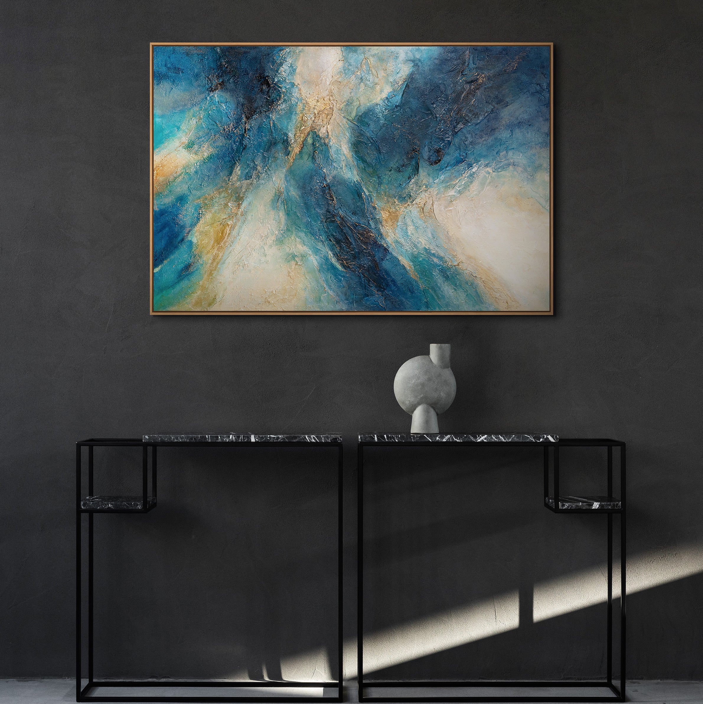 This hand-painted textured painting is a perfect fit for modern, nautical, and elegant interiors. The dynamic composition creates a striking focal point in living rooms, offices, or spacious hallways. Thanks to its high-quality execution, rich texture, and brilliant color depth, this artwork visibly enhances any room and brings a sense of spaciousness and tranquility.