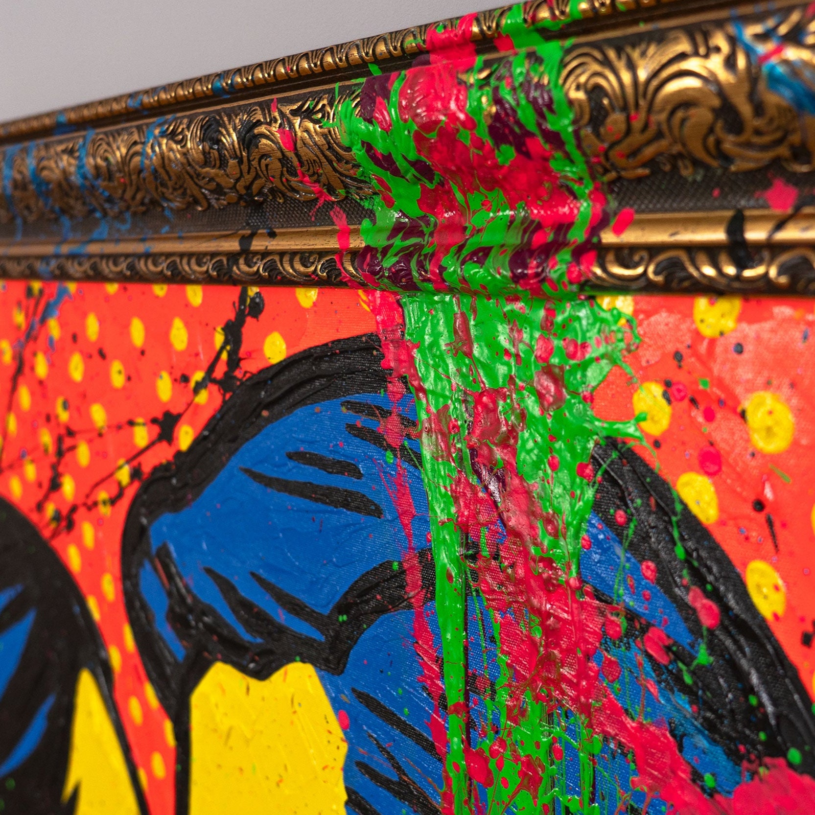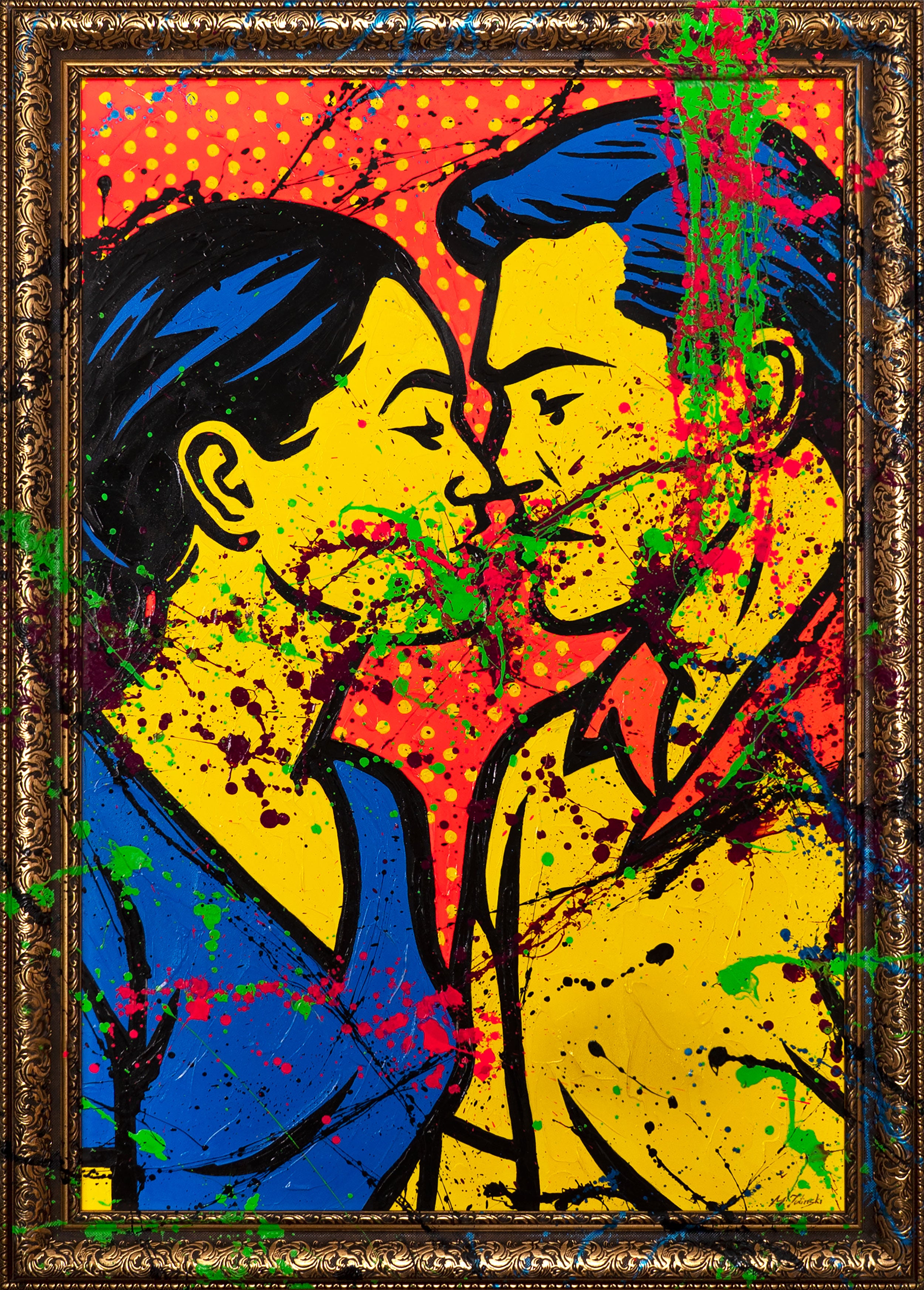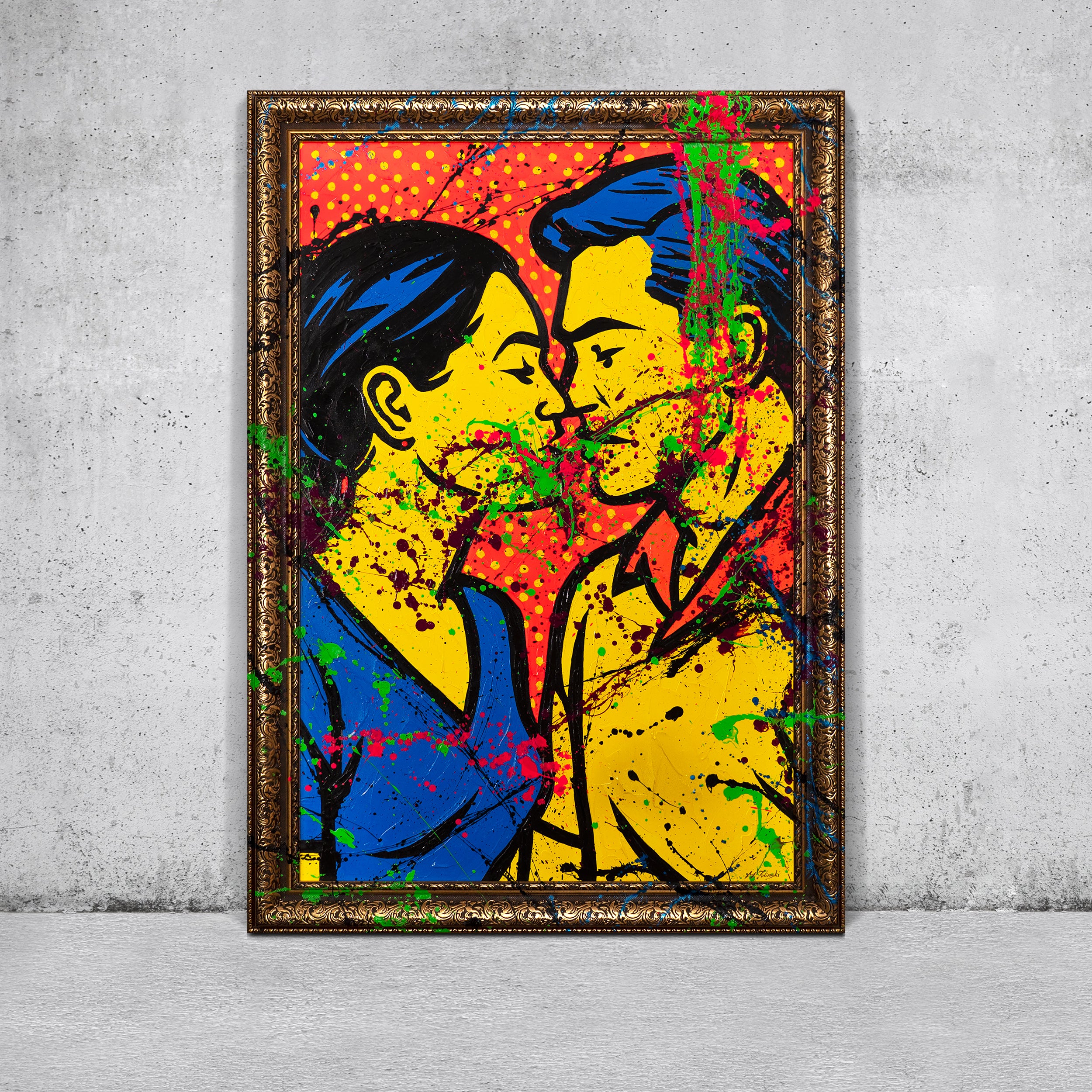 „Colorful Kiss“ depicts a couple in iconic Pop Art style – bright yellow faces, intense blue tones, and a red background with dots. Dynamic splashes of green, pink, and black bring energy and urban flair to the artwork. Every brushstroke is hand-painted, making this piece a unique statement blending romance and street art.