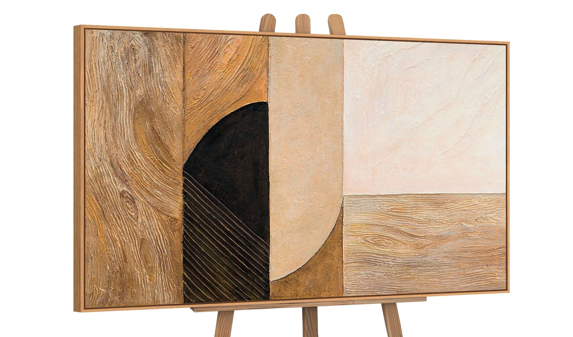 „Natürliche Ornamente“ vereint die Harmonie der Natur mit der Strenge geometrischer Ordnung. Fließende Holzstrukturen treffen auf weiche Formen und kontrastierende Flächen in Braun, Beige und Schwarz. Das Werk wirkt erdig und warm – eine Hommage an organische Schönheit und natürliche Textur.