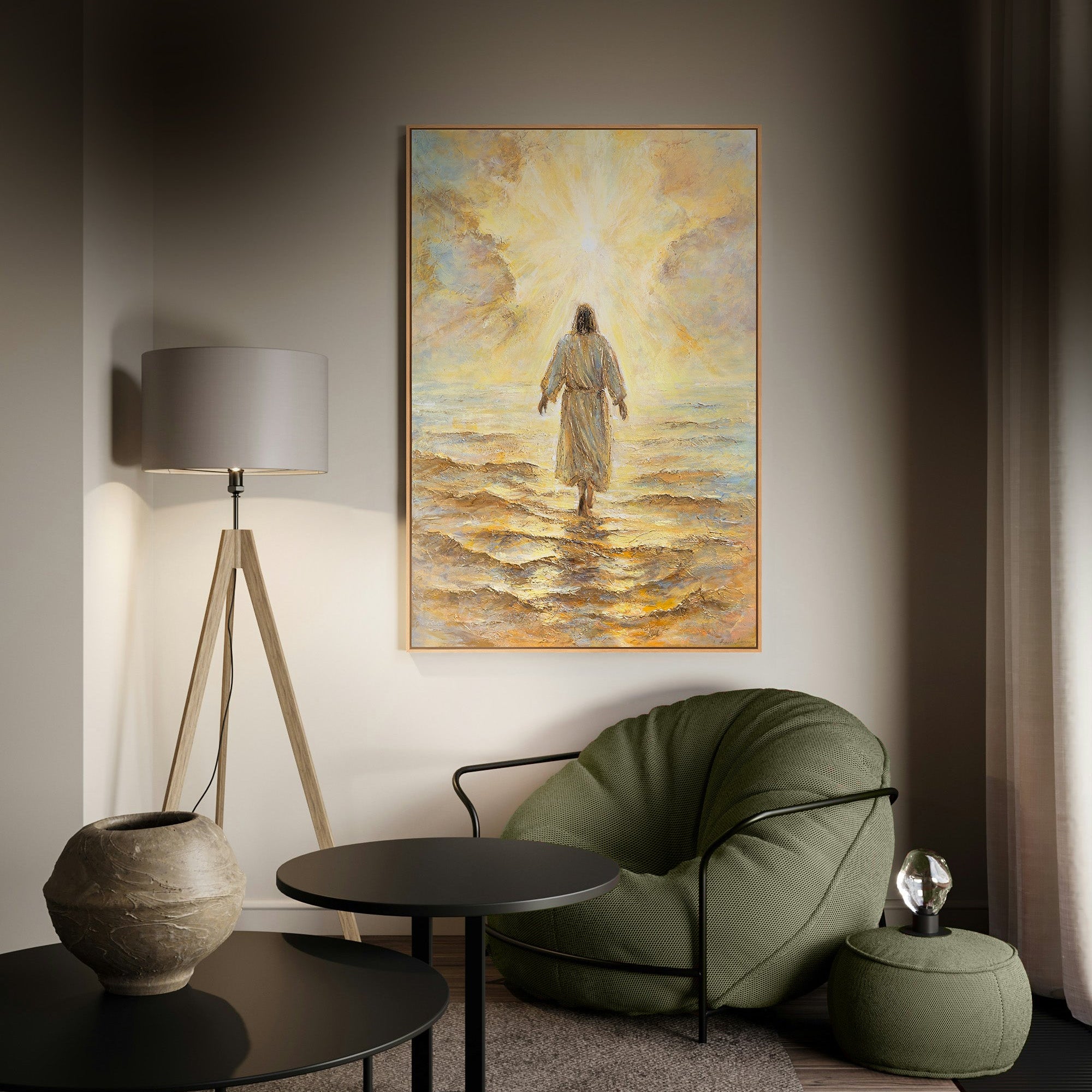 „Strahlkraft des Glaubens“ zeigt eine inspirierende Szene von Jesus, der in einem goldenen Licht über das Wasser geht. Diese religiöse Darstellung symbolisiert den göttlichen Glauben und das Licht, das Christus in die Welt bringt. Der Anblick von Christus in dieser einzigartigen Himmelsstrahlung vermittelt Frieden, Hoffnung und spirituelle Stärke.
