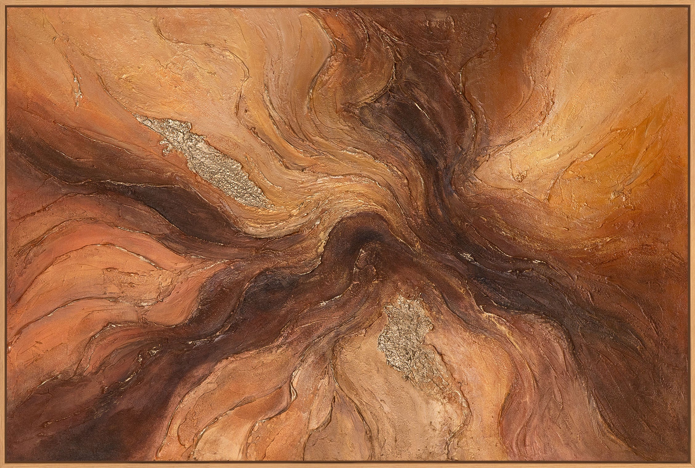 „Bernsteinfarbene Ströme“ ist ein ausdrucksstarkes abstraktes Acrylgemälde mit fließender Bewegung und warmen, erdigen Farbschichten. Bernstein-, Braun- und Goldtöne verschmelzen zu einer dynamischen Komposition, die Tiefe, Wärme und natürliche Energie ausstrahlt. Die stark strukturierte Oberfläche betont den handgemalten Charakter und verleiht dem Werk eine hochwertige, haptische Präsenz.