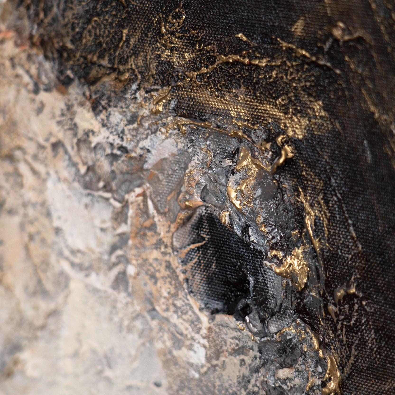 • Abstrakte Strukturmalerei in Schwarz und Grau, Detailaufnahme auf Leinwand