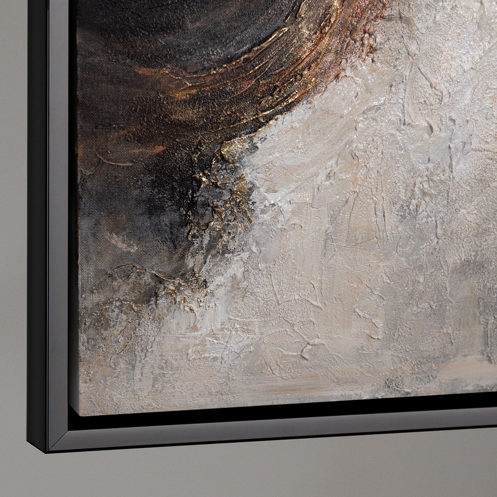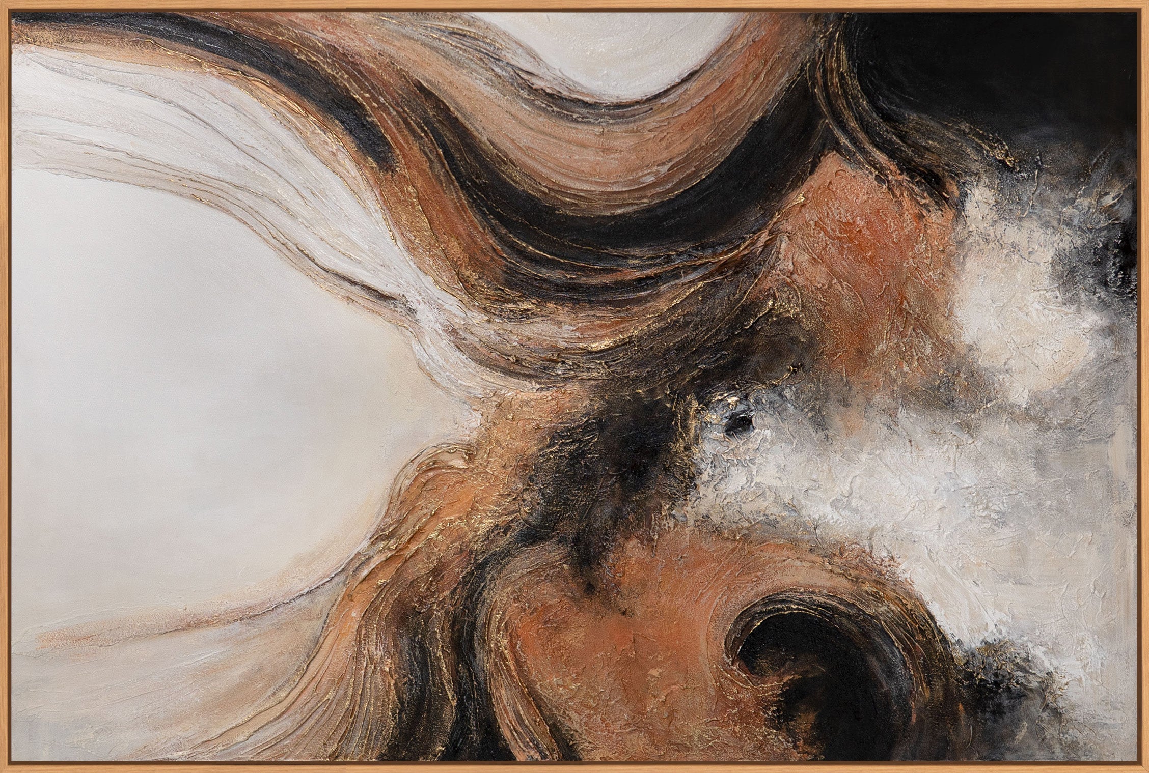 • Detail eines abstrakten Leinwandbildes mit kupferfarbenen Akzenten, strukturierte Oberfläche