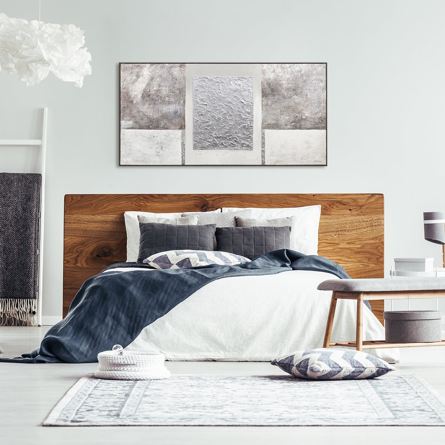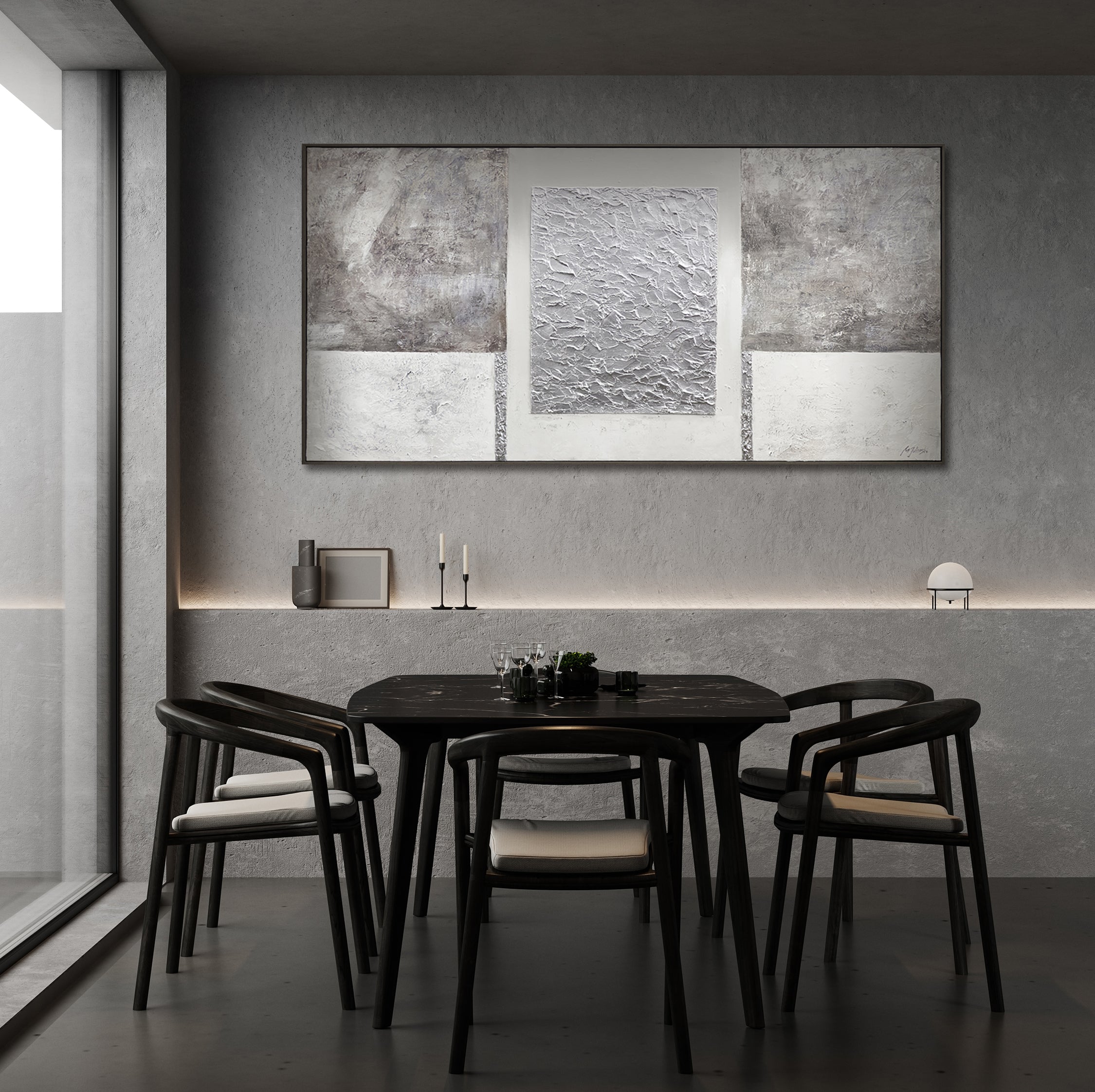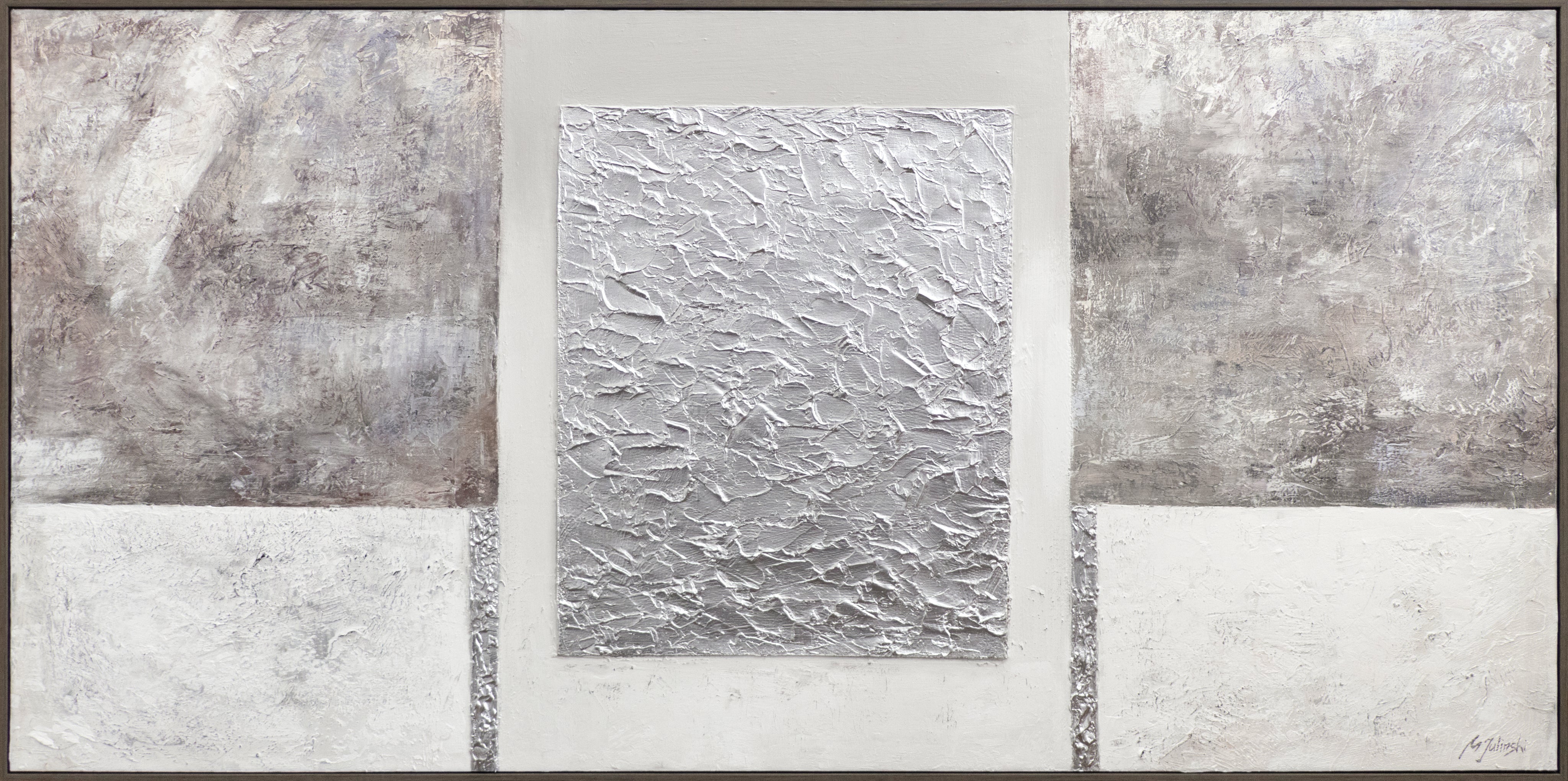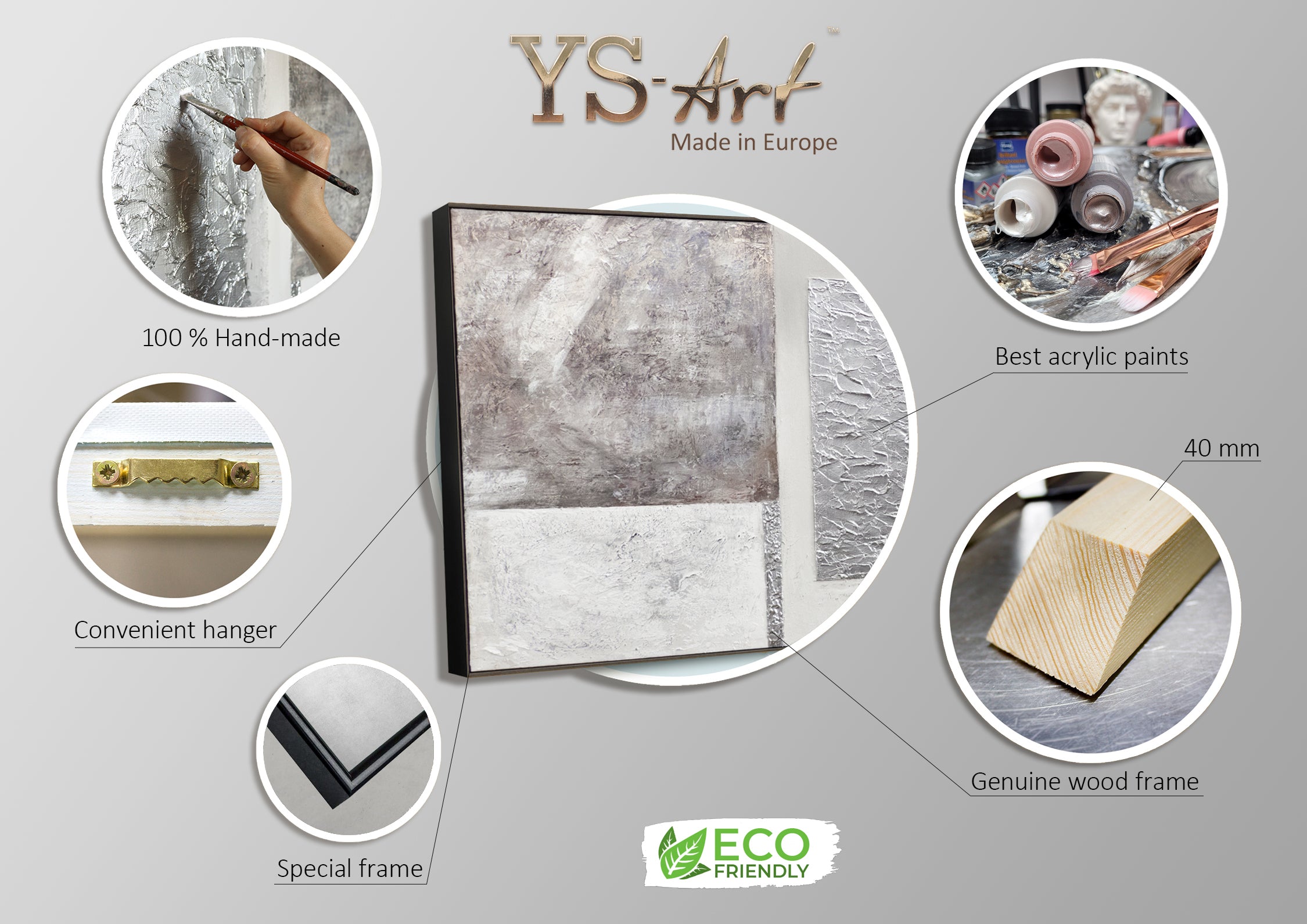 This high-quality, handmade artwork from the YS-Art DeLuxe Collection captivates with its harmonious combination of gray, silver, and white tones, coupled with an impressive texture technique that adds depth and elegance. The premium frame ensures stability and a luxurious presentation.