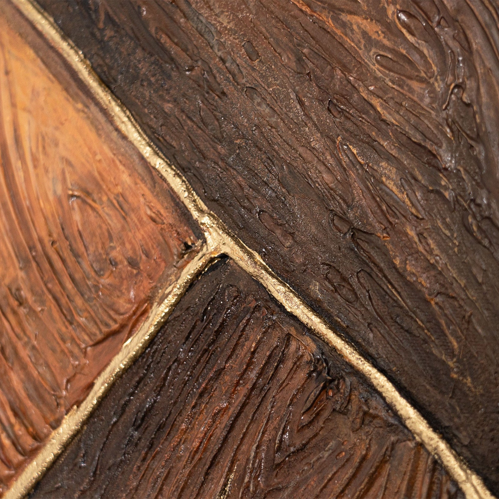 This canvas art is created using water-based acrylic paints, forming a layered geometric composition with carved textures and intersecting shapes. Warm brown, sand, bronze and natural wood tones interact across the surface, creating large wall decor that feels architectural yet refined. The artwork works especially well as wall art contemporary interiors where texture and material presence play a key role. Each piece is created entirely in-house — no prints, no reproductions, no imports.