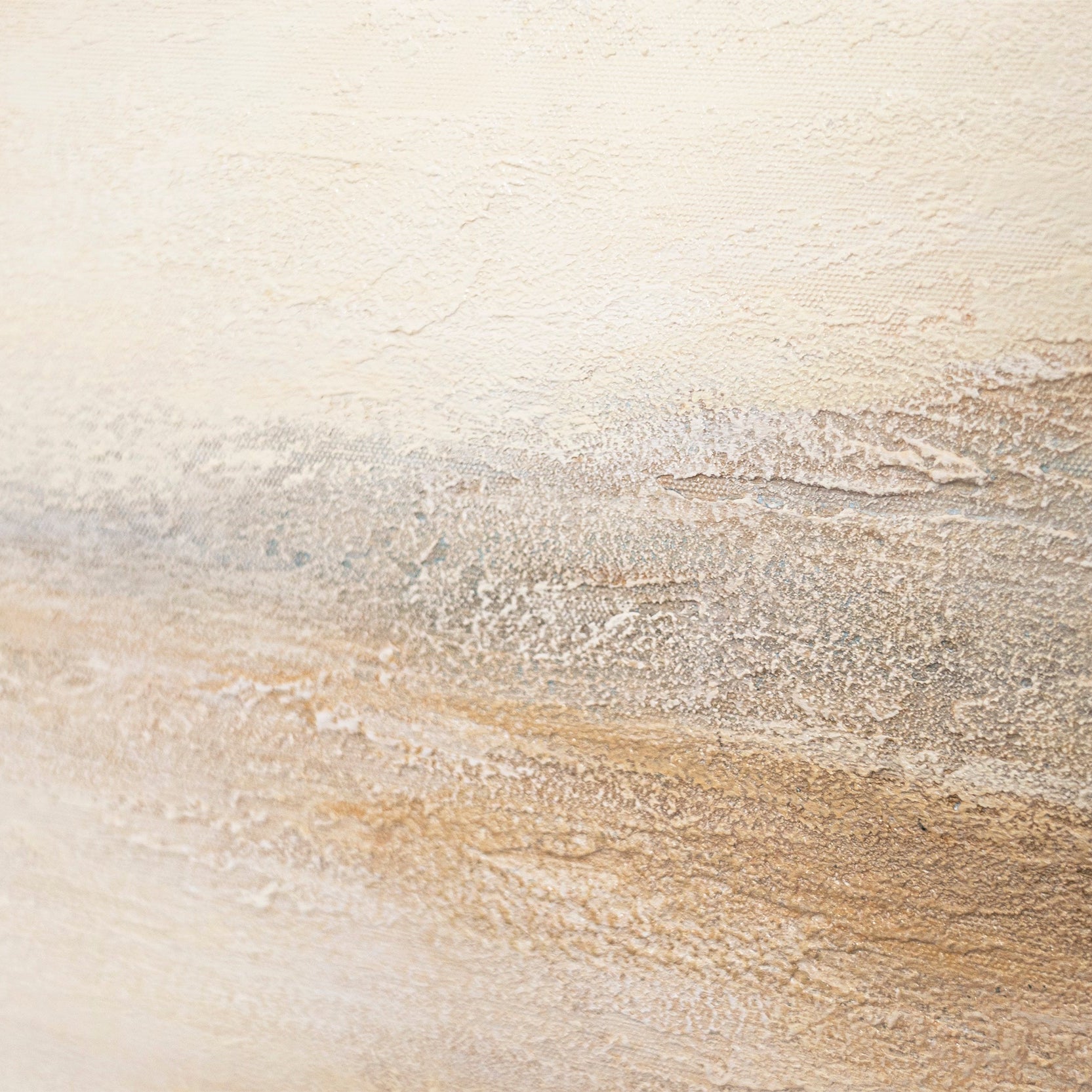 „Nebeliger Morgen“ fängt die stille Poesie eines erwachenden Tages ein. In sanften Beigetönen, feinen Graunuancen und zarten Lichtreflexen entsteht eine atmosphärische Landschaft, die Ruhe und Tiefe zugleich vermittelt. Die strukturierte Oberfläche verleiht dem Werk eine spürbare Haptik, als würde Nebel über eine weite Ebene ziehen.
