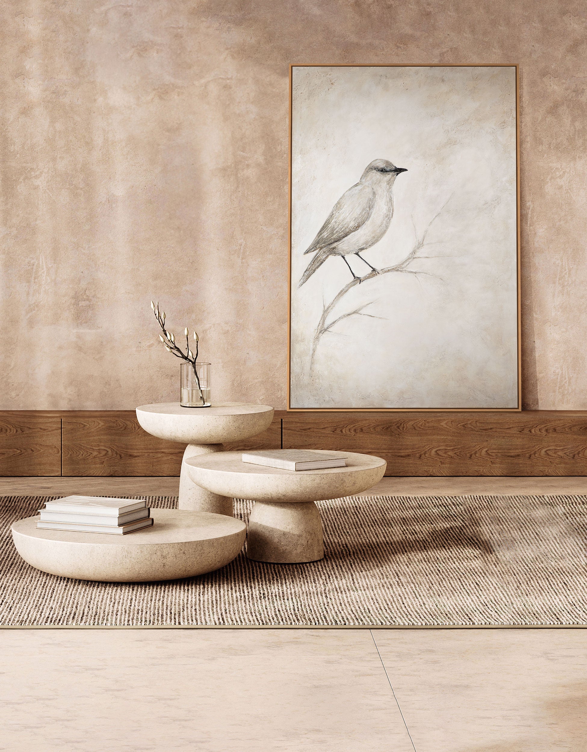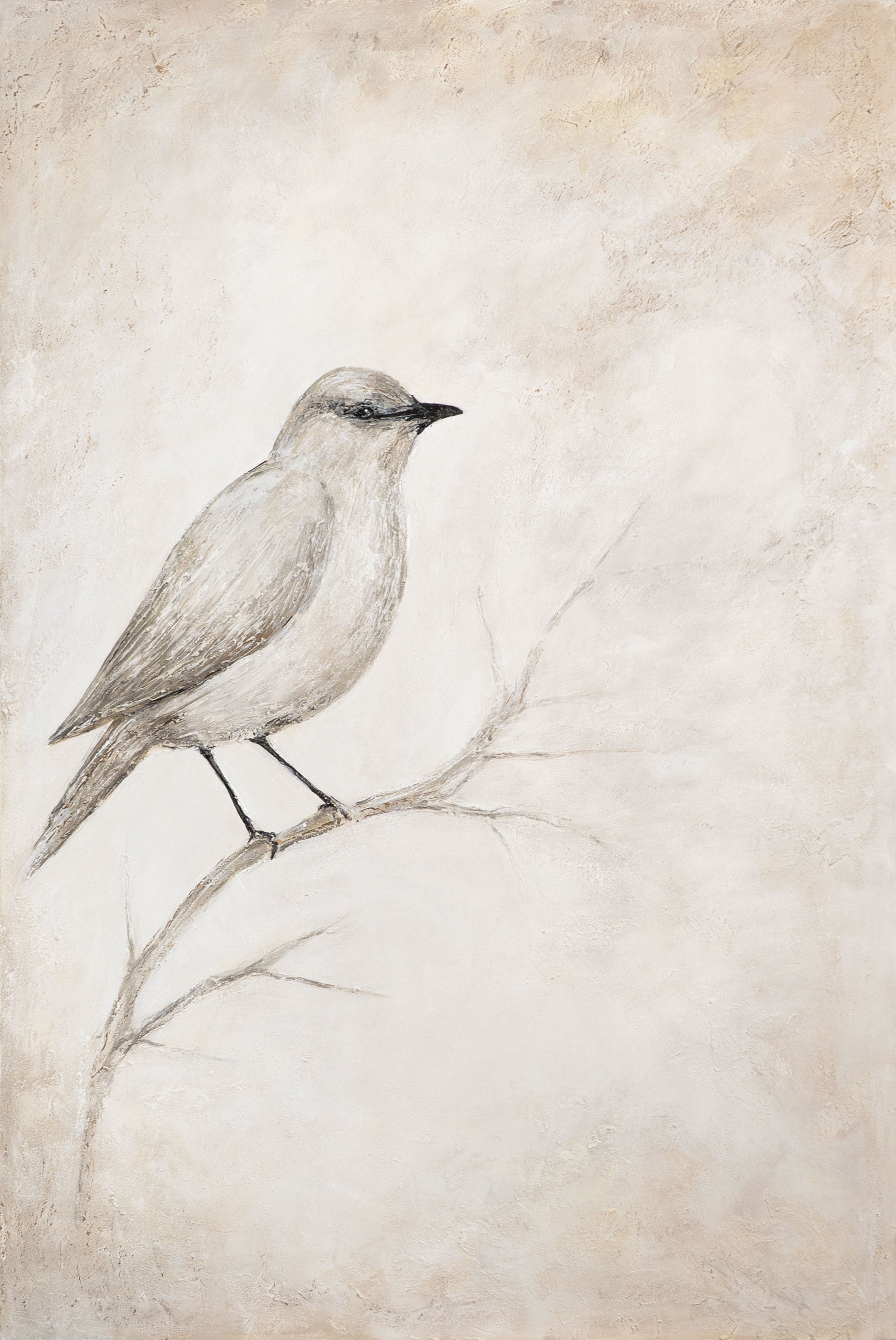 "Singing Pause" captures a delicate moment of stillness. A single bird perches on a branch, surrounded by soft beige tones and a subtle texture. The tranquil composition lends the image a poetic lightness, while the tactile surface exudes depth and naturalness.