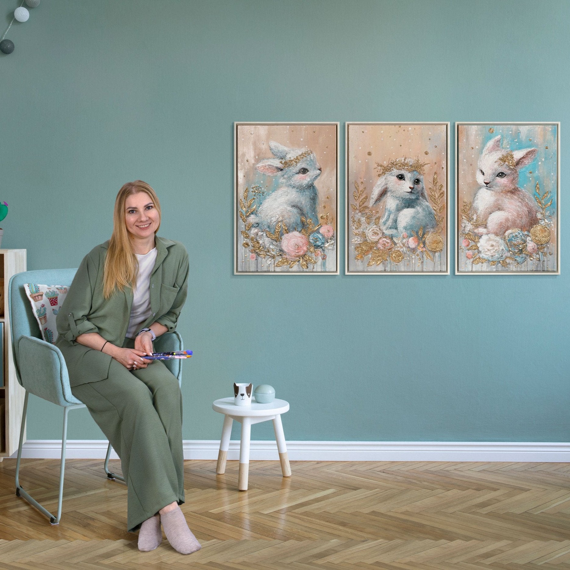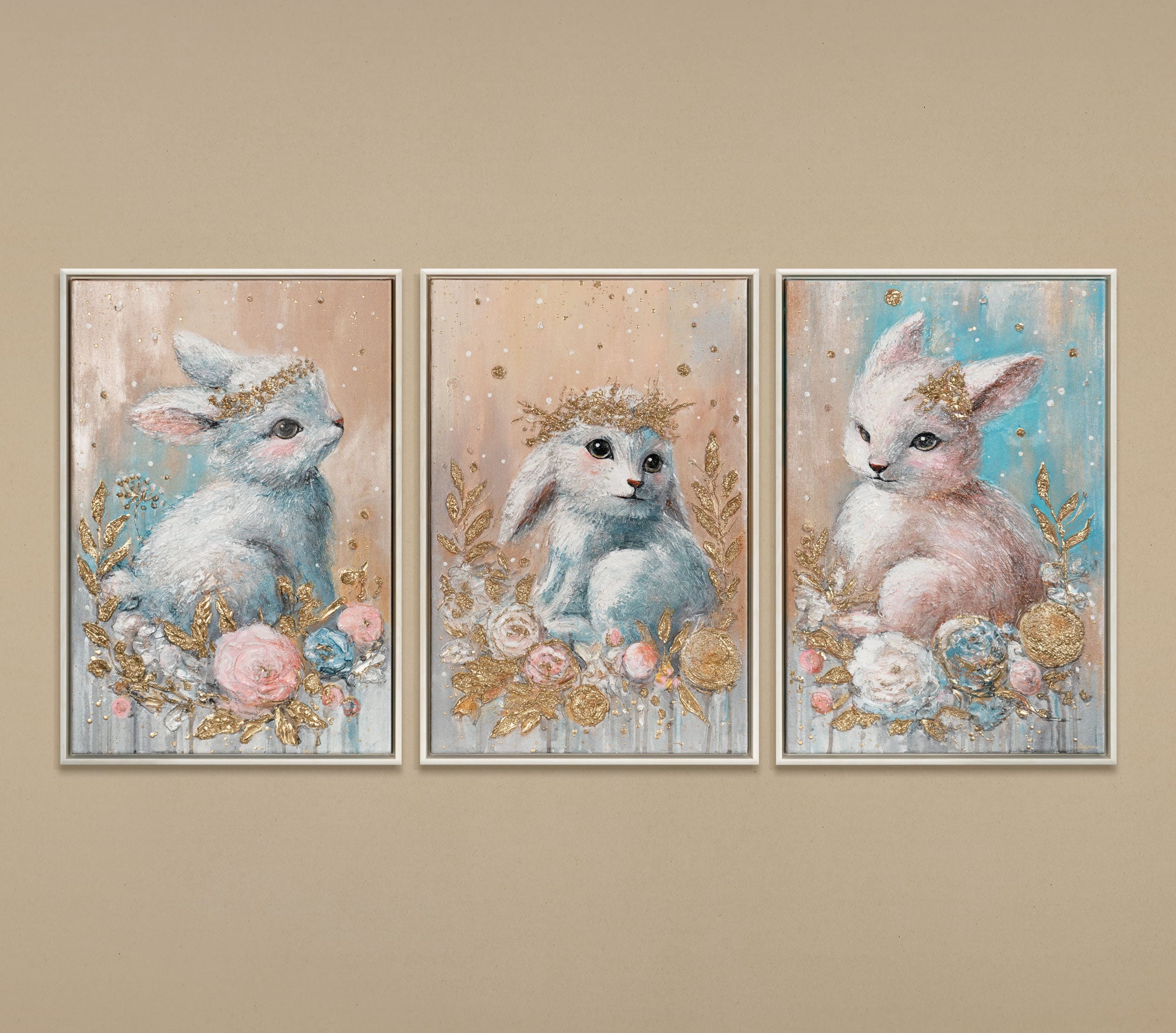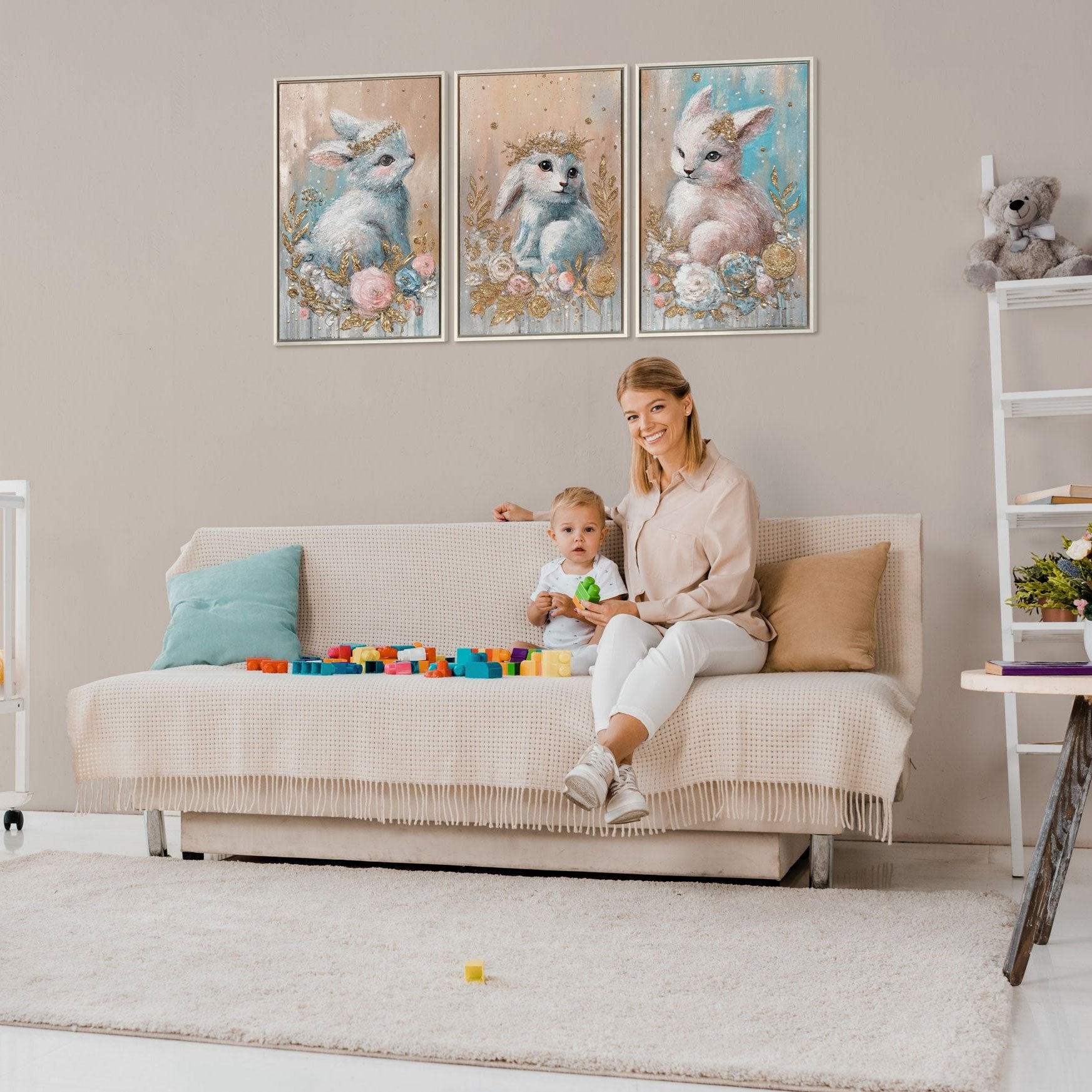 Create a magical atmosphere in your child’s room with this charming hand-painted bunny triptych. Featuring three adorable rabbits surrounded by floral motifs and shimmering golden details, this canvas painting combines warmth, color, and child-friendly elegance. A perfect piece of original artwork for modern kids’ spaces.
