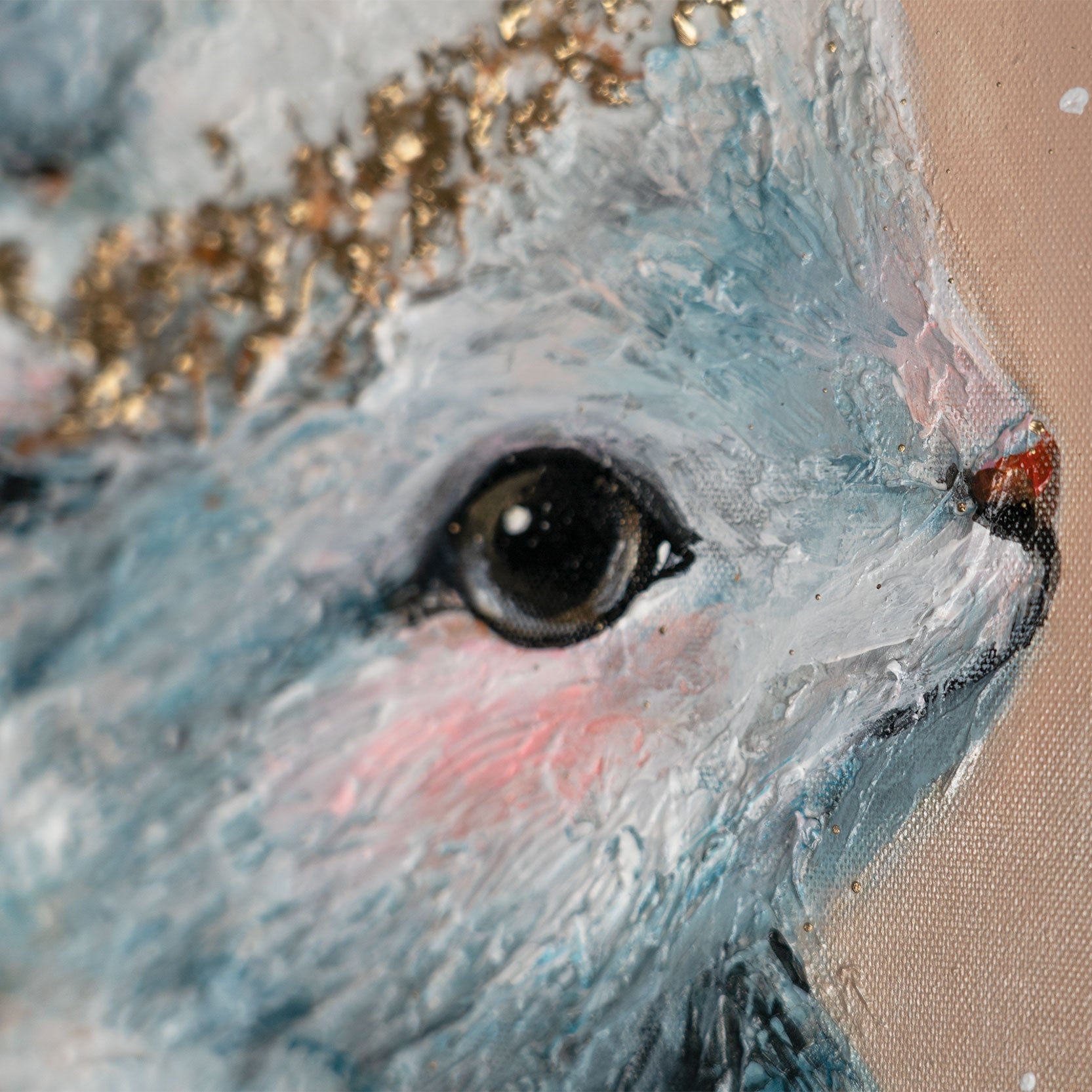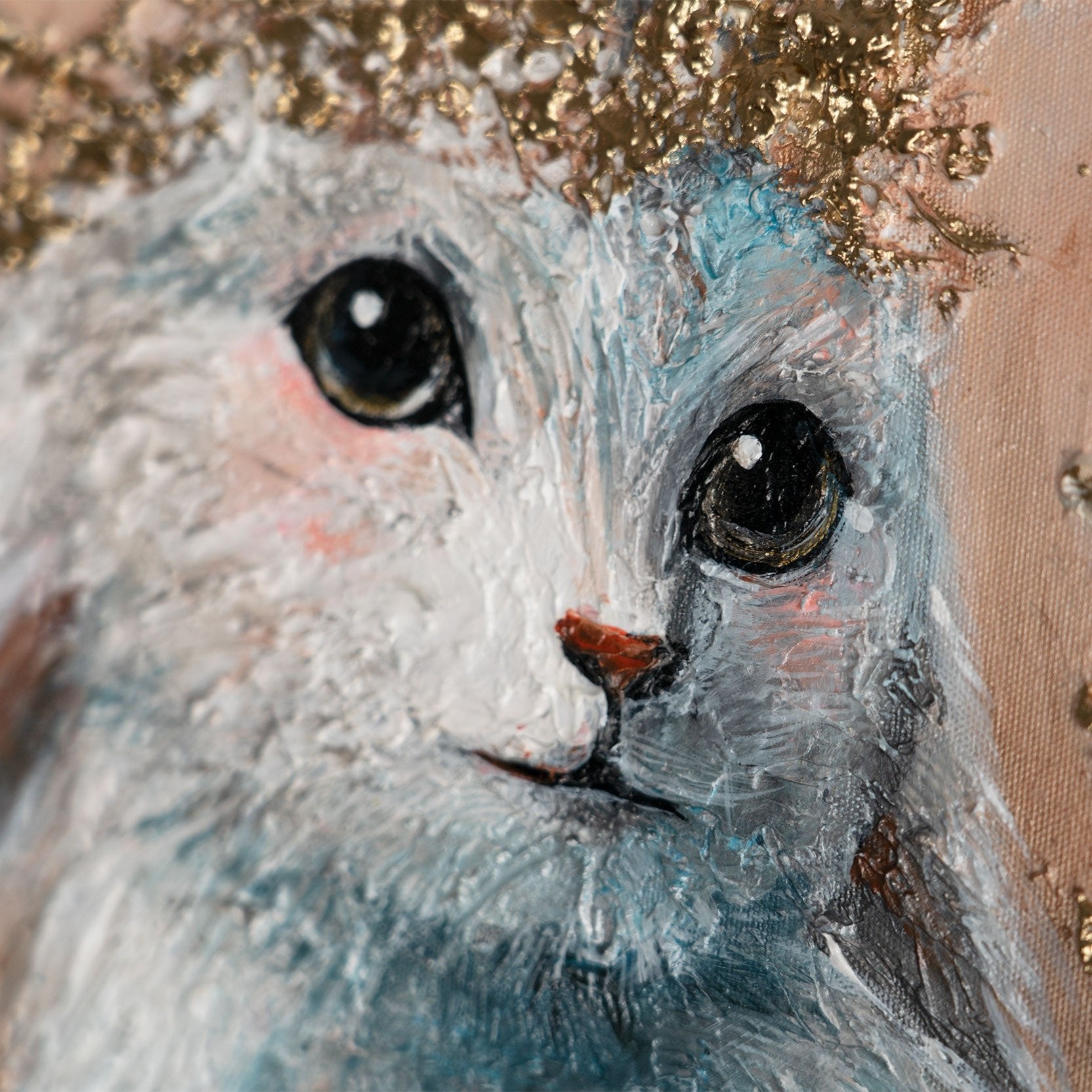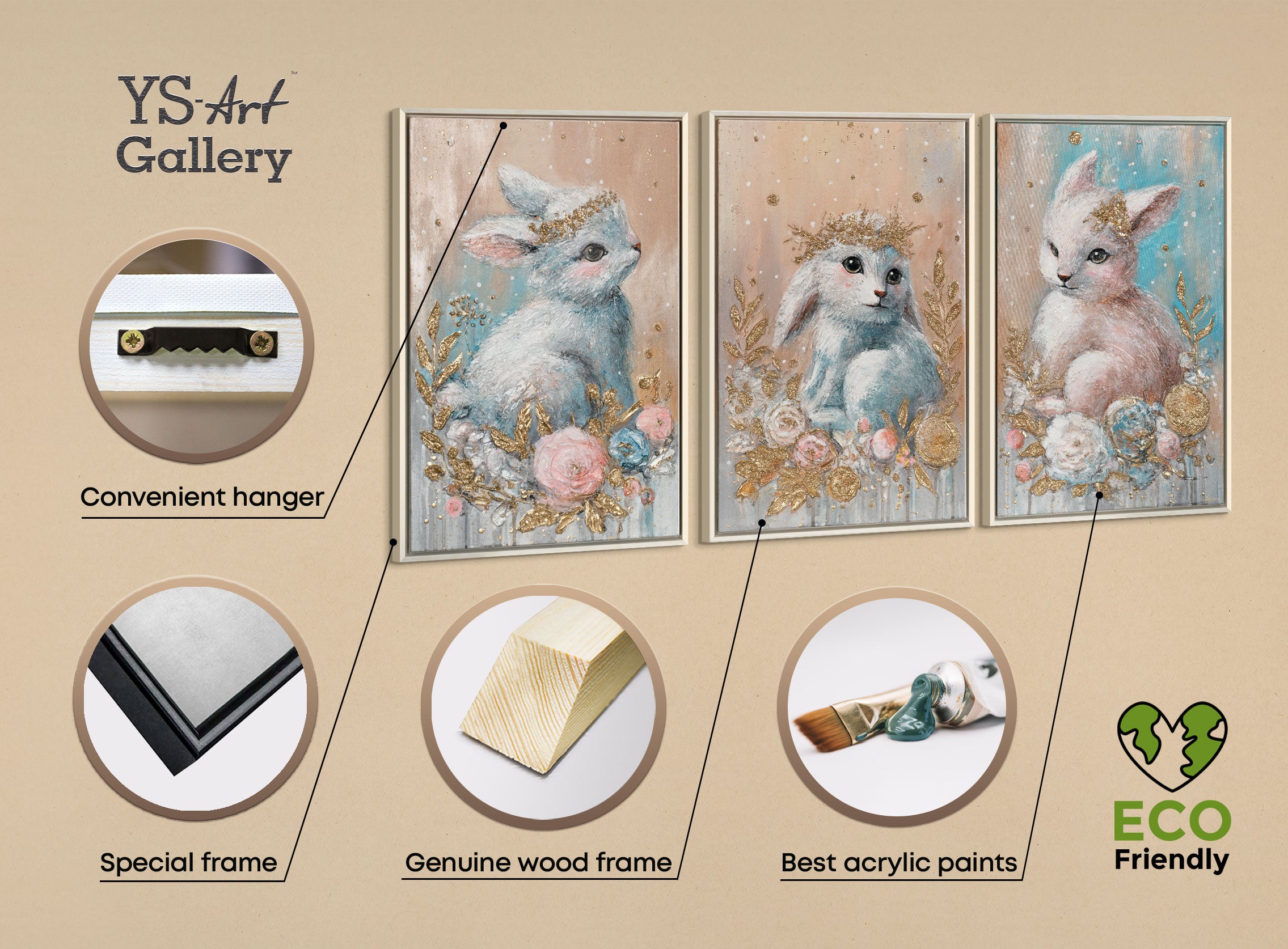 Create a magical atmosphere in your child’s room with this charming hand-painted bunny triptych. Featuring three adorable rabbits surrounded by floral motifs and shimmering golden details, this canvas painting combines warmth, color, and child-friendly elegance. A perfect piece of original artwork for modern kids’ spaces.