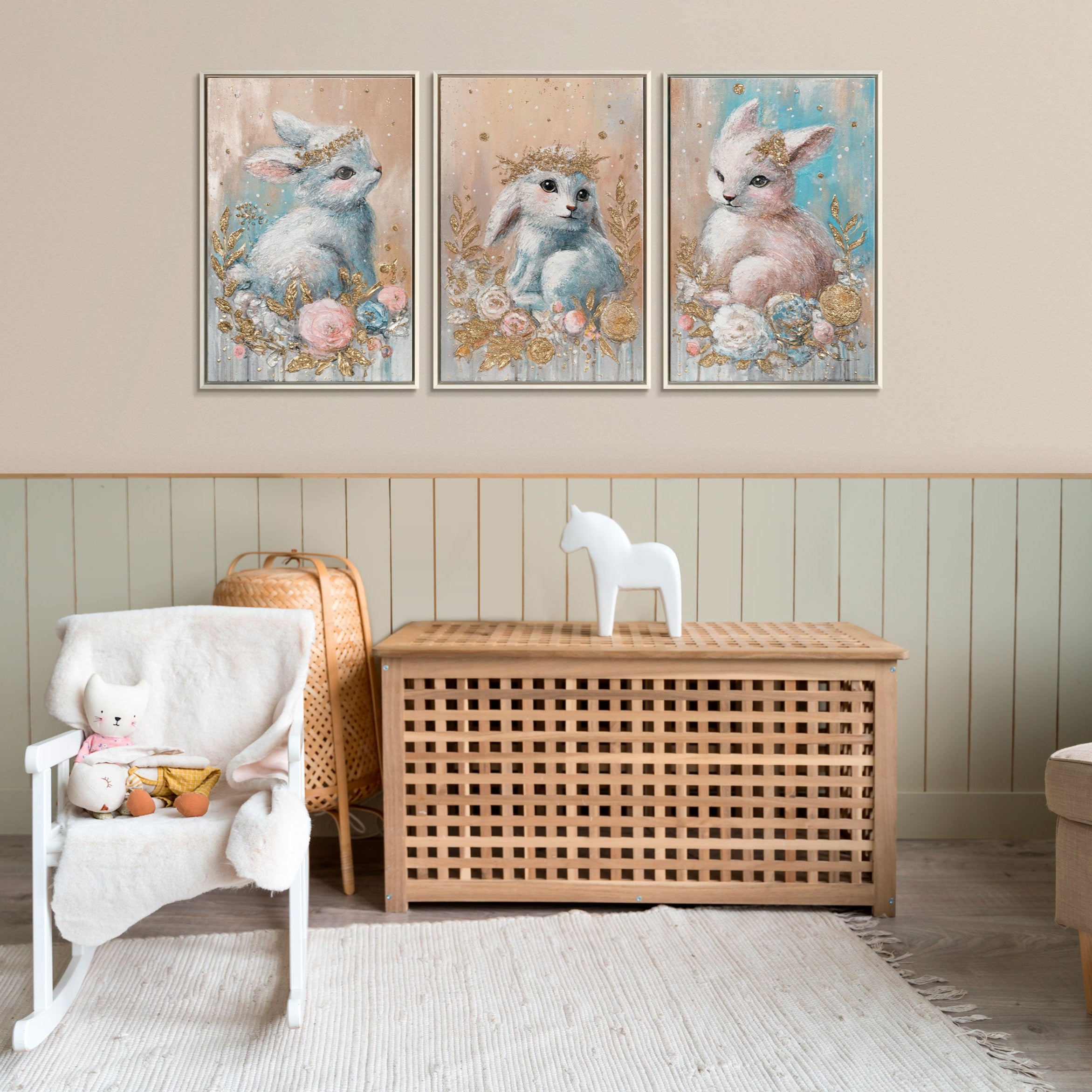 • Hand-Painted Canvas Wall Art for Kids – Bunny Triptych with Floral Accents